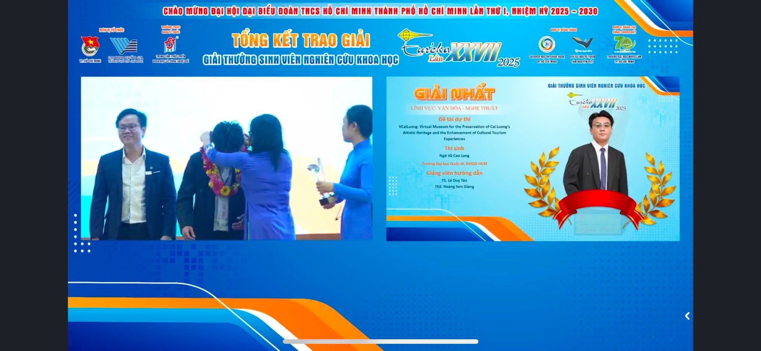 Sáng ngày 7/12/2025, tại Hội trường Trần Chí Đáo, ĐHQG HCM, Lễ trao giải Giải thưởng Sinh viên Nghiên cứu Khoa học Euréka 2025 đã chính thức diễn ra với sự tham gia của hàng ngàn sinh viên đến từ nhiều trường đại học trên toàn quốc. Trong số các đề tài nổi bật, công trình “VCaiLuong: Virtual Museum for the Preservation of Cai Luong’s Artistic Heritage and the Enhancement of Cultural Tourism Experiences” của AIoT Lab VN đã xuất sắc giành Giải Nhất lĩnh vực Văn hóa - Nghệ thuật, khẳng định sự sáng tạo và năng lực nghiên cứu của sinh viên AIoT Lab VN.